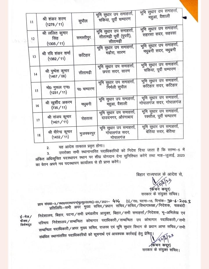 पटना : बिहार में शुक्रवार को बड़े पैमाने पर तबादला किया गया. बिहार सरकार ने पंचायती राज विभाग, राजस्व एवं भूमि सुधार विभाग, ग्रामीण विकास विभाग और योजना एवं विकास विभाग में कई पदाधिकारियों को इधर से उधर किया है. जारी अधिसूचना में 228 नए प्रखंड विकास पदाधिकारी BDO की पोस्टिंग की गई है.