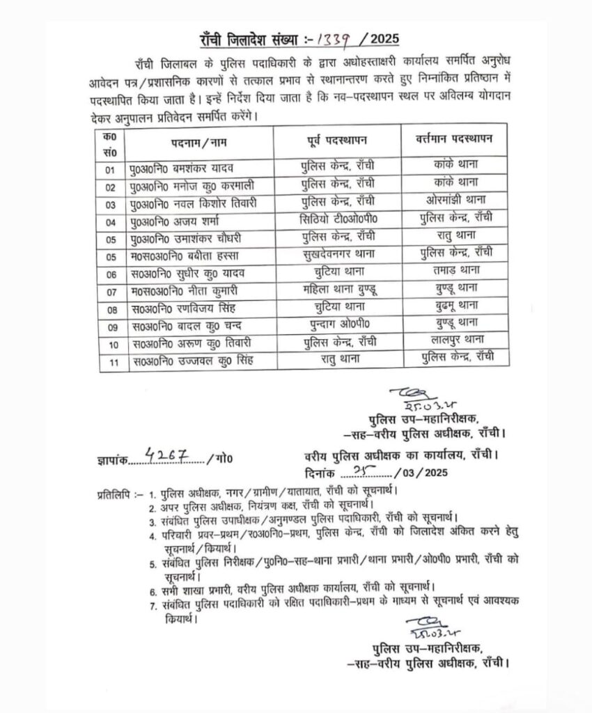 Ranchi: पुलिस विभाग में बड़े पैमाने पर तबादला आदेश जारी किया गया है। राजधानी रांची के डीआईजी सह SSP ने इस संबंध में आदेश जारी कर दिया है।