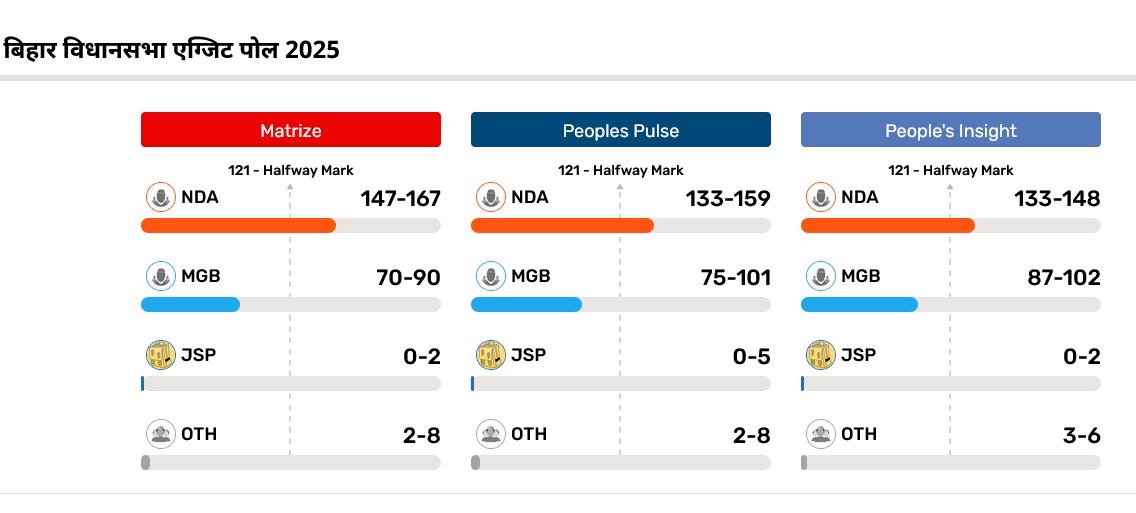 जेवीसी एग्जिट पोल में भी एनडीए को 135-150 सीटों के बीच बढ़त मिलती दिख रही है, जबकि महागठबंधन को 88-103 सीटें मिलने की संभावना है। इसी क्रम में पीपल्स इंसाइट के सर्वे में भी एनडीए को 133-148 और महागठबंधन को 87-102 सीटें मिलने का अनुमान व्यक्त किया गया है।