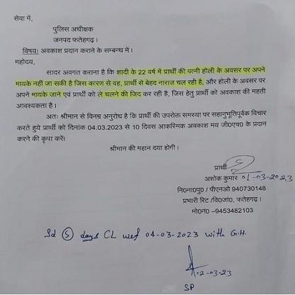 अशोक कुमार ने अपने आवेदन में लिखा है कि उनकी पत्नी शादी के 22 साल से होली के अवसर पर अपने नहीं जा सकी है, जिस कारण से वह मुझसे नाराज चल रही है और होली के अवसर पर अपने मायके जाने और मुझसे साथ चलने की जिद कर रही है। इसलिए छुट्टी की बेहद जरूरत है। आपसे अनुरोध है कि मेरी समस्या पर सहानुभूति पूर्वक विचार करते हुए 4 मार्च से 10 दिन की आकस्मिक छुट्टी प्रदान करें।